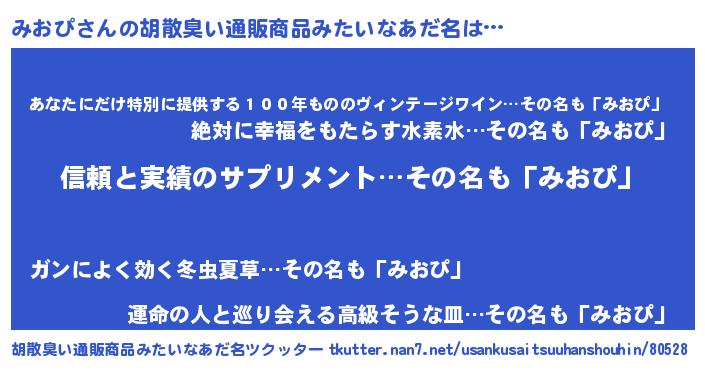 | 意味不明あだ名 | 『とにかく怪しいみおぴ』 |