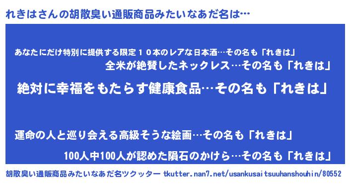 | 男性向けラノベタイトル風あだ名 | 『れきはという概念が存在しない退屈な世界 』 |