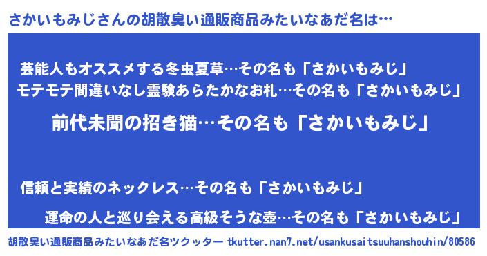 | ヘコむあだ名 | 『さかいもみじ(小並感)』『レバニラ』 |