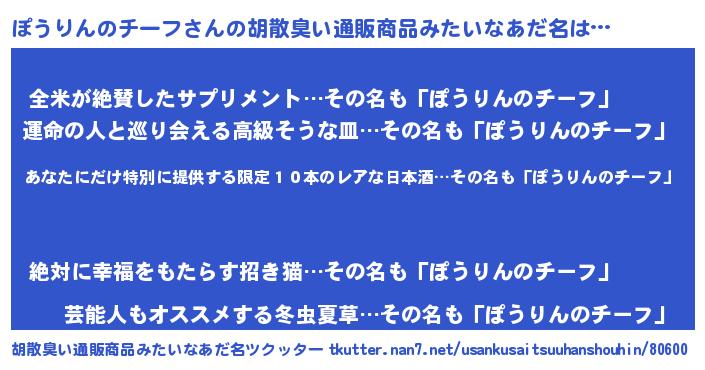 | 男性向けラノベタイトル風あだ名 | 『ぽうりんのチーフ~年齢イコール彼女いない歴の魔法使い~』 |