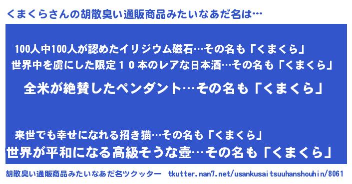 | ヒーロー風カッコイイあだ名 | 『天弓騎士クマ』『正義の使者くまくら』 |