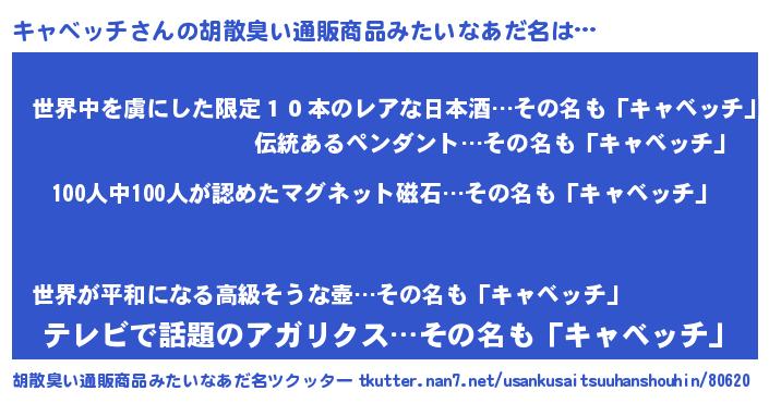 | 男性向けラノベタイトル風あだ名 | 『おまえをオタクにしてやるから、俺をキャベッチにしてくれ! 』 |