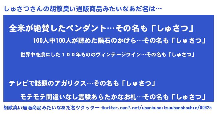 | 男性向けラノベタイトル風あだ名 | 『魔弾の王としゅさつ』『しゅさつの憂鬱』 |