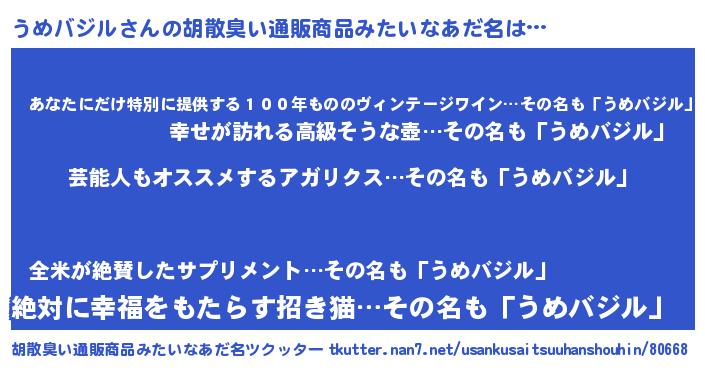 | 意味不明あだ名 | 『自称うめバジル』『永久保存うめバジル』 |