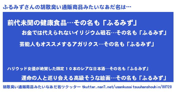 | 男性向けラノベタイトル風あだ名 | 『ふるみずに滅ぼされるだけの簡単なお仕事です』 |