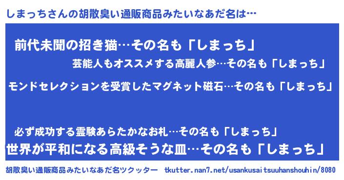 | 意味不明あだ名 | 『つくし科しまっち属』『自称しまっち』 |