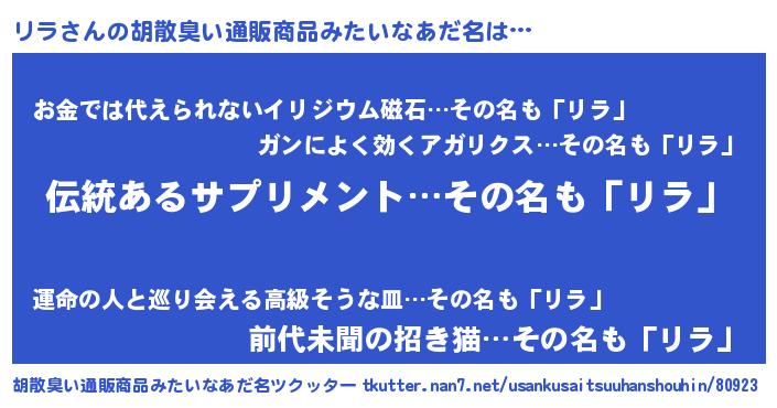 | 男性向けラノベタイトル風あだ名 | 『リラの嫁は女の子じゃないと思った?』 |