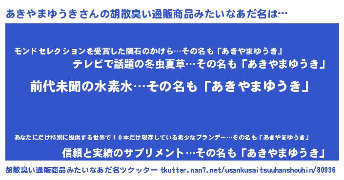 | ヘコむあだ名 | 『あきやまゆうき(苦笑)』『あきっ子』 |