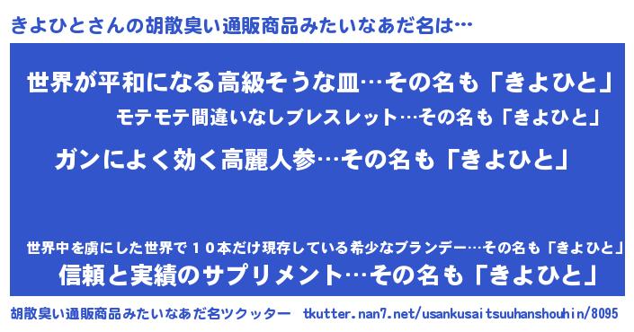 | 女子向けラノベタイトル風あだ名 | 『きよひとなんてお断りですっ。』 |