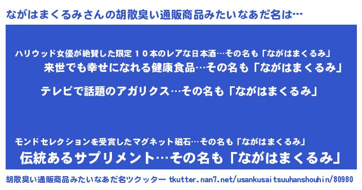 | 男性向けラノベタイトル風あだ名 | 『ながはまくるみに滅ぼされるだけの簡単なお仕事です』 |