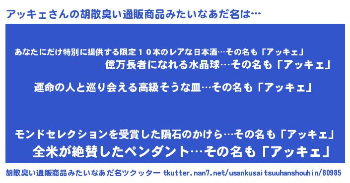 | 女子向けラノベタイトル風あだ名 | 『アッキェの婚約者』 |