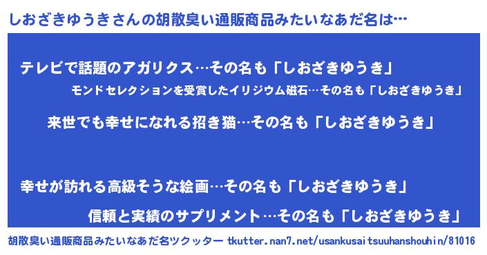 | 意味不明あだ名 | 『永久保存しおざきゆうき』 |