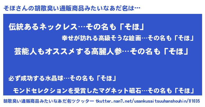 | 意味不明あだ名 | 『ニラ科そほ属』『自称そほ』 |