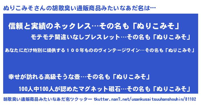 | 意味不明あだ名 | 『住所不定無職ぬりこみそ(10歳)』 |