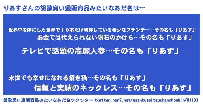 | ヘコむあだ名 | 『りあを』『りあす(震え声)』『牛乳』 |