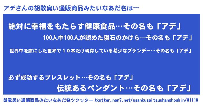 | 男性向けラノベタイトル風あだ名 | 『この素晴らしい世界にアデを!』 |