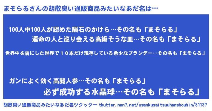 | 意味不明あだ名 | 『住所不定無職まそらる(74歳)』 |