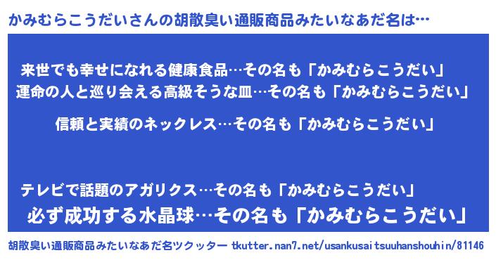 | ヘコむあだ名 | 『かみ太郎』『かみむらこうだい(笑)』 |