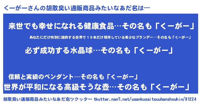 | 男性向けラノベタイトル風あだ名 | 『くーがーの憂鬱』『魔弾の王とくーがー』 |