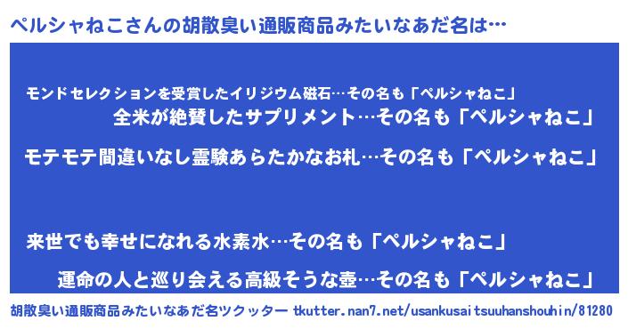 | 男性向けラノベタイトル風あだ名 | 『ペルシャネコアートオンライン』 |