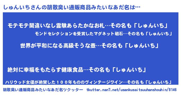 | 男性向けラノベタイトル風あだ名 | 『転生したらしゅんいちだった件』 |