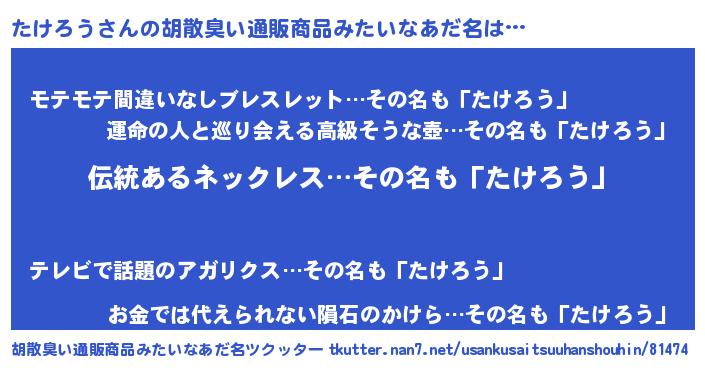 | 意味不明あだ名 | 『とにかく怪しいたけろう』 |