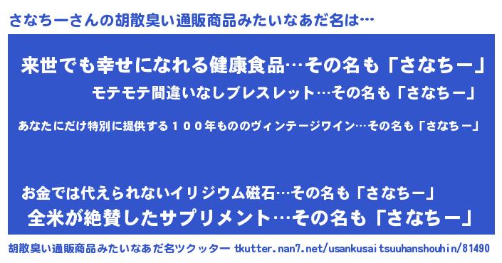 | 意味不明あだ名 | 『住所不定無職さなちー(1歳)』 |