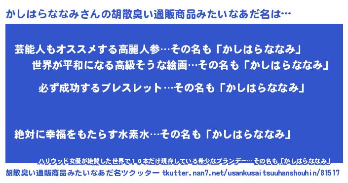| 意味不明あだ名 | 『しいたけ科かしはらななみ属』 |
