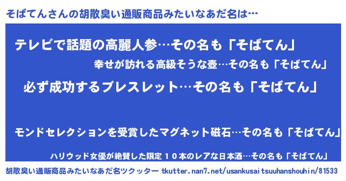 | 男性向けラノベタイトル風あだ名 | 『そばてんの憂鬱』『緋弾のソバテン』 |