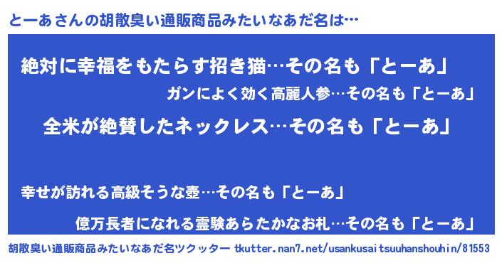| 男性向けラノベタイトル風あだ名 | 『とーあの嫁は女の子じゃないと思った?』 |