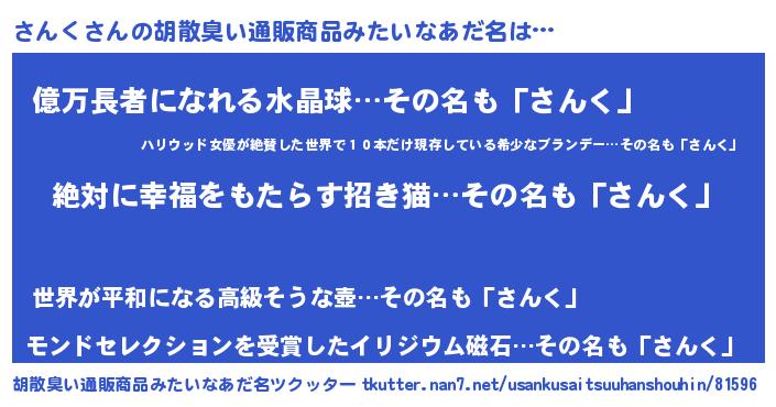 | 男性向けラノベタイトル風あだ名 | 『さんくという概念が存在しない退屈な世界 』 |