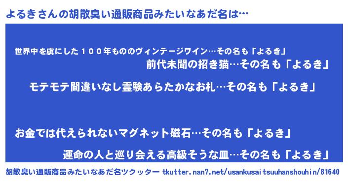 | 男性向けラノベタイトル風あだ名 | 『ヨルキアートオンライン』 |