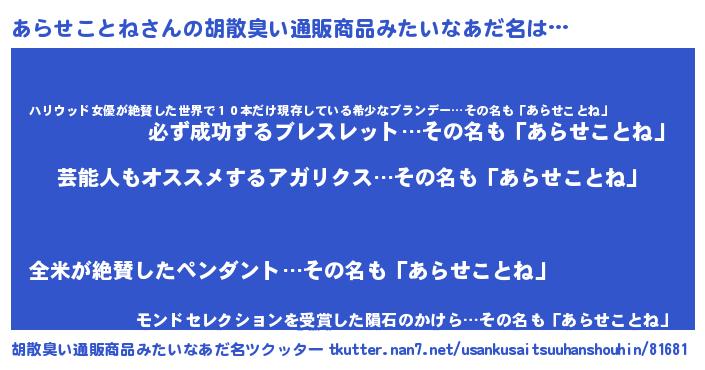 | 男性向けラノベタイトル風あだ名 | 『Re:あらせことねから始める異世界生活』 |