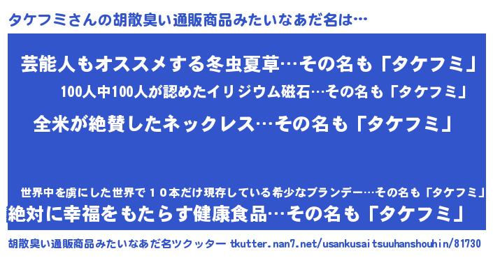 | ヘコむあだ名 | 『タケっぺ』『タケフミ(苦笑)』 |
