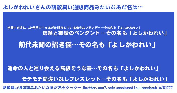 | 恥ずかしいあだ名 | 『よしちん』『プリティーよしかわれい』 |