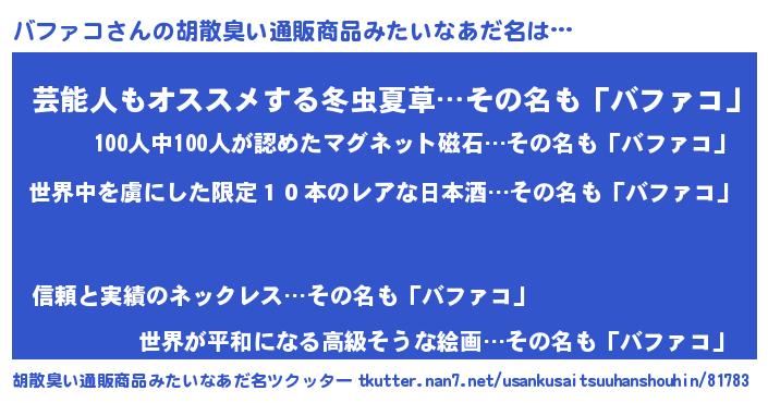 | 意味不明あだ名 | 『住所不定無職バファコ(56歳)』 |