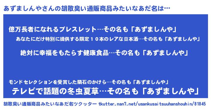 | 男性向けラノベタイトル風あだ名 | 『あずましんやという概念が存在しない退屈な世界 』 |