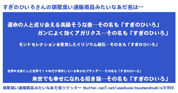 | 男性向けラノベタイトル風あだ名 | 『すぎのひいろに滅ぼされるだけの簡単なお仕事です』 |