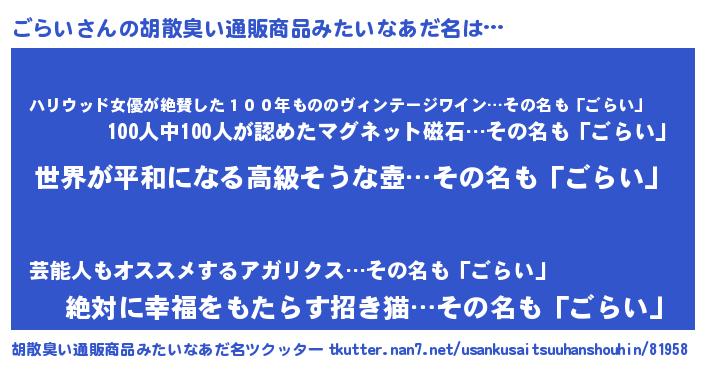 | 男性向けラノベタイトル風あだ名 | 『転生したらごらいだった件』 |