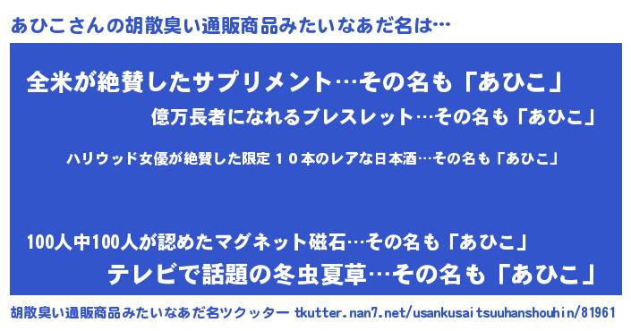 | 意味不明あだ名 | 『住所不定無職あひこ(59歳)』『自称あひこ』 |