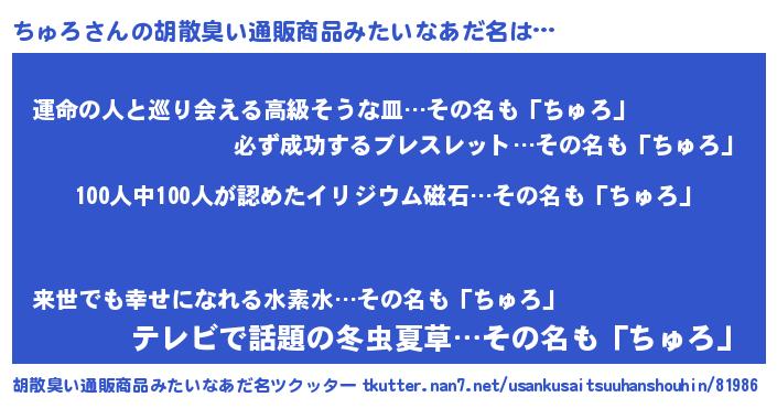 | 男性向けラノベタイトル風あだ名 | 『おまえをオタクにしてやるから、俺をちゅろにしてくれ! 』 |