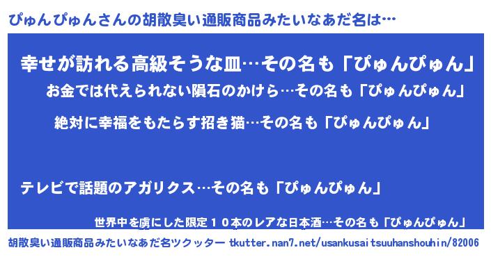 | 男性向けラノベタイトル風あだ名 | 『ぴゅんぴゅんという概念が存在しない退屈な世界 』 |