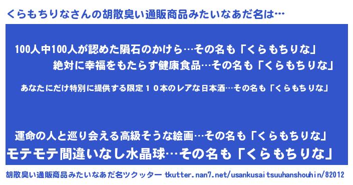 | ヘコむあだ名 | 『くらもー』『くらもちりな(震え声)』 |