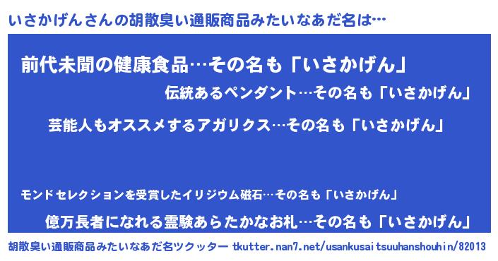 | 意味不明あだ名 | 『自称いさかげん』『永久保存いさかげん』 |