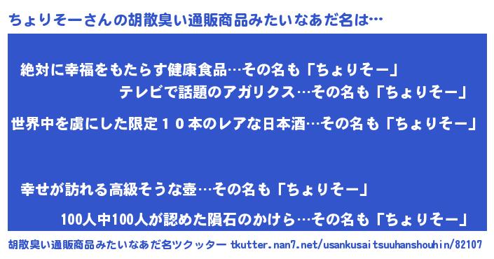 | 意味不明あだ名 | 『住所不定無職ちょりそー(40歳)』 |