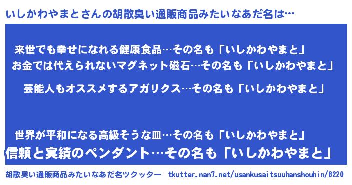 | ヘコむあだ名 | 『いしかわやまと(笑)』『いしお』 |