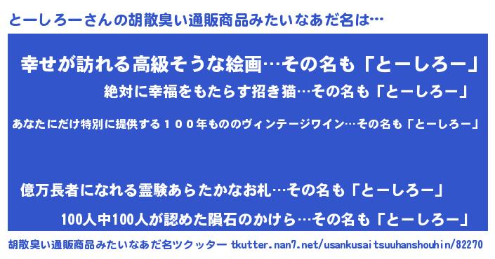 | ヒーロー風カッコイイあだ名 | 『仮面トーダー』『正義の使者とーしろー』 |