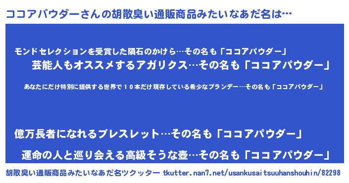 | 男性向けラノベタイトル風あだ名 | 『この素晴らしい世界にココアパウダーを!』 |