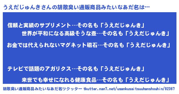 | 男性向けラノベタイトル風あだ名 | 『うえだじゅんきに滅ぼされるだけの簡単なお仕事です』 |