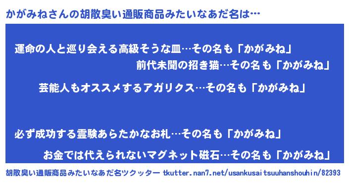 | 意味不明あだ名 | 『ヨモギ科かがみね属』『自称かがみね』 |